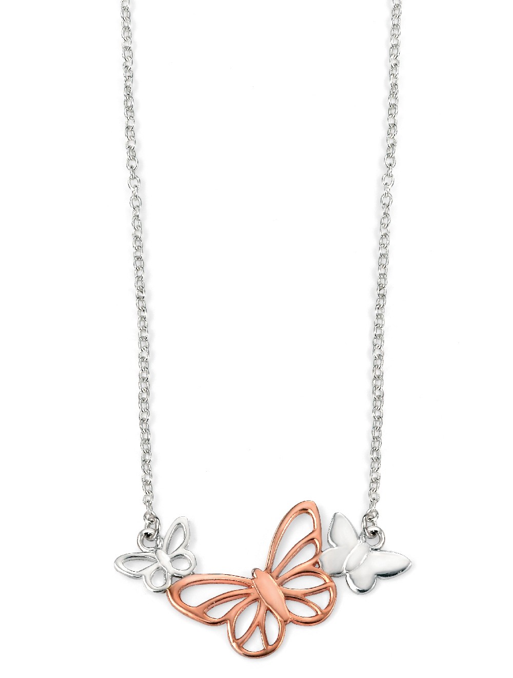 Strieborný náhrdelník so sviežim motívom troch motýľov. Najväčší z nich je v strede a má zlaté pokovanie. Ďalšie dva sú strieborné. Náhrdelník je dodávaný s certifikátom kvality.